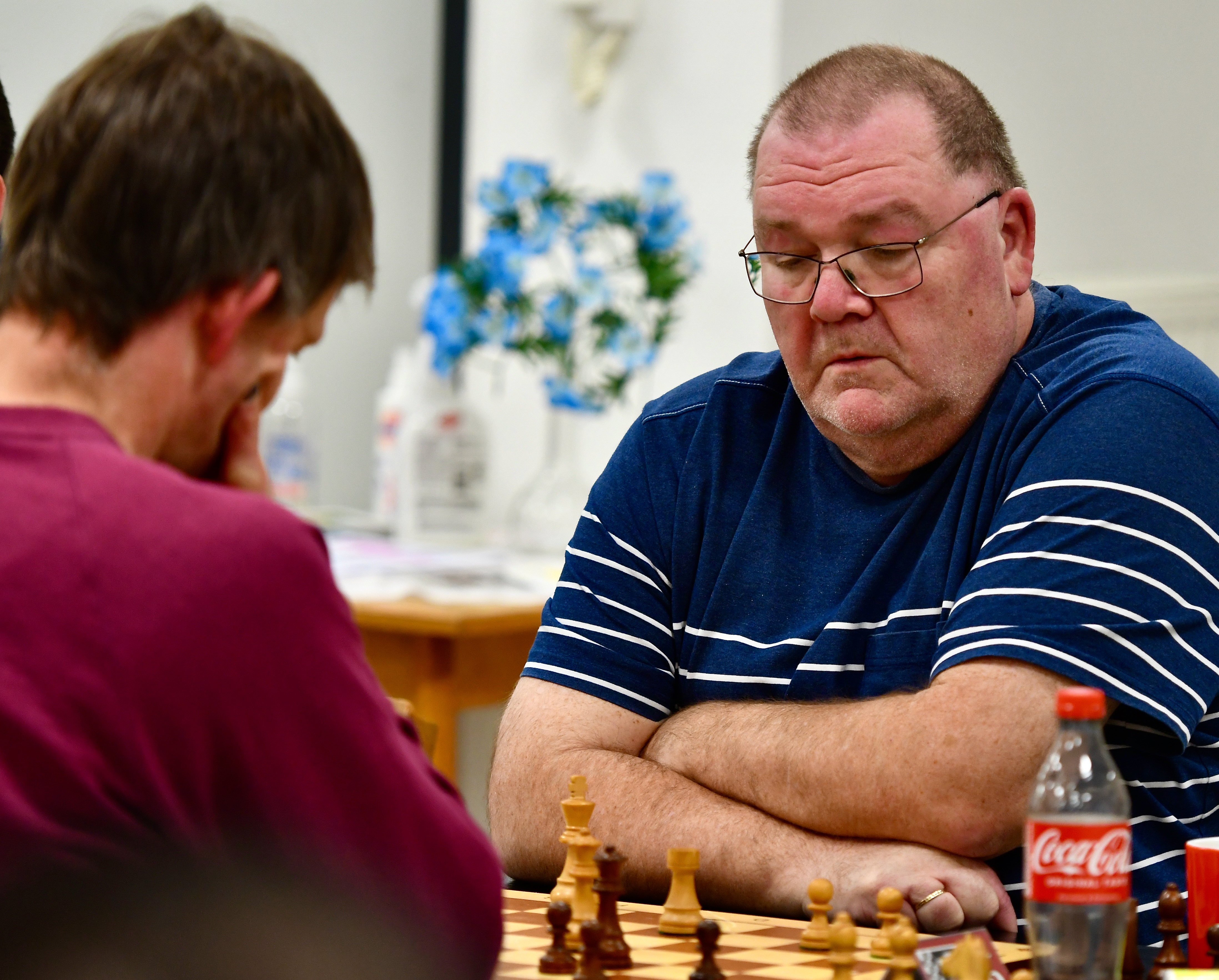 Schalksmühle, 19. Oktober 2023: In der 4. Runde der Offenen Stadt- und Gemeinde-Meisterschaft in Halver und Schalksmühle hielten sich die Turnierfavoriten schadlos: Daniel Babczyk siegte mit Schwarz in einem Königsinder gegen Peter Kernchen. Im 28. Zug gelang Babczyk ein Figurengewinn, dazu besaß er zwei Mehrbauern, nach knapp drei Stunden gab Kernchen auf. Josef Horstmann setzte sich in deutlich kürzerer Zeit souverän gegen Rüdiger Nieland durch. Babczyk (4/4) und Horstmann (3,5/4) treffen nun in der letzten Runde im direkten Duell aufeinander und machen den Titel unter sich aus. In der dritten Partie des Donnerstagabends trennten sich Lothar Mirus und Vladimir Dolgopolyj mit einem Remis. Mirus hatte im Mittelspiel die Qualität geopfert und dafür vier Mehrbauern erhalten. Zwei musste er zurückgeben, stand aber immer noch sehr gut, als Dolgopolyj nach 3:15 Stunden mit einem Dauerschach das Remis erzwang.