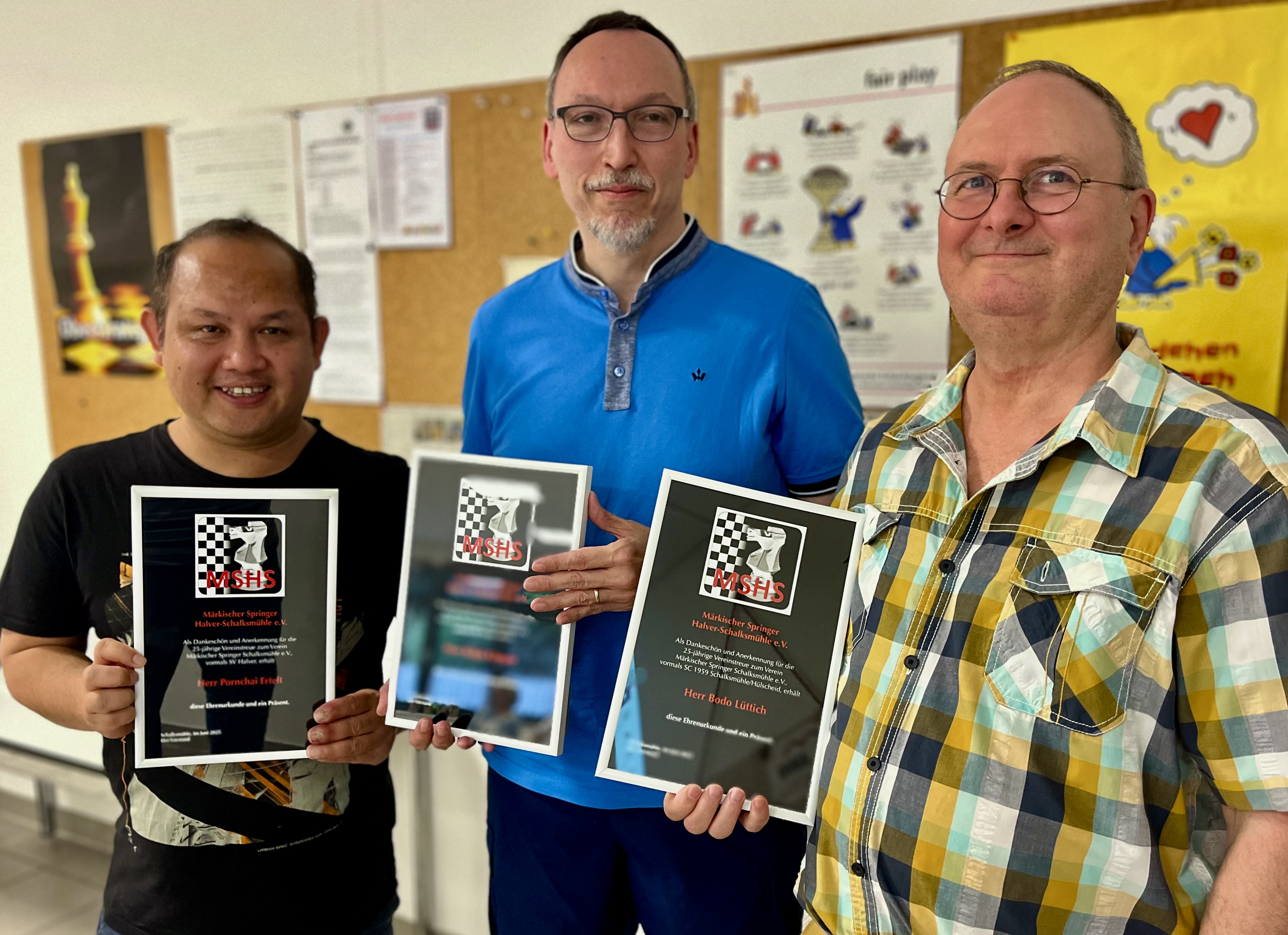 Neben den Ehrungen der Turniersieger (Vereinsmeister und Sieger des Triathlons: Daniel Babczyk, Vereinsmeister Schnellschach: Ralph Kämper, Vereinsmeister Blitzschach: Dirk Jansen, Gewinner APG-Pokal: Adrian Babczyk) wurden drei Mitglieder für ihre langjährige Vereinstreue mit einer Urkunde und einem Präsent ausgezeichnet: Ralph Kämper trat 1985 dem SV Halver bei, ist beim SVH und später beim Fusionsvereins MSHS nun seit 40 Jahren als Mitglied dabei. Auf jeweils 25 Jahre im Verein schauen in diesem Jahr Pornchai Ertelt und Bodo Lüttich zurück.