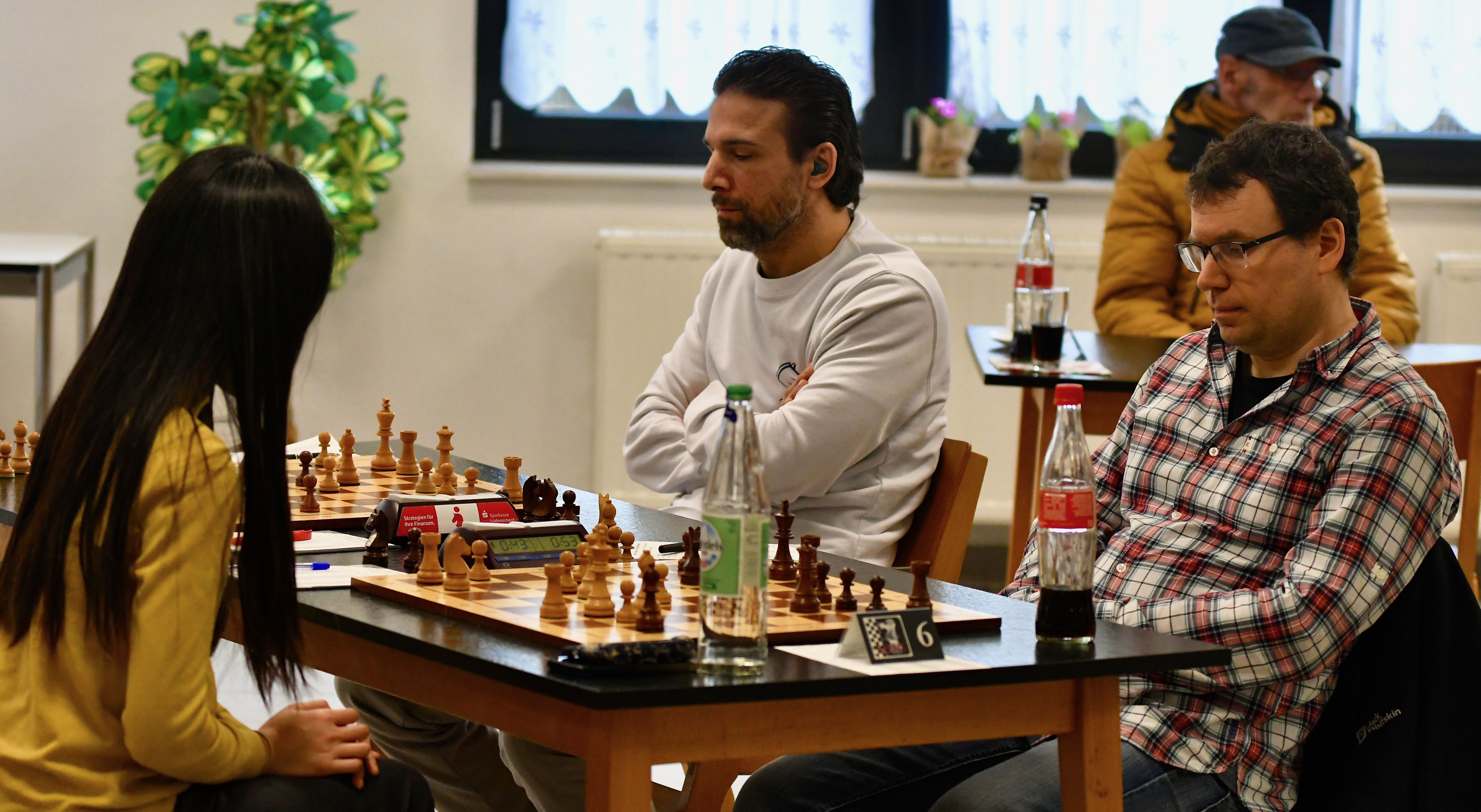 In Wattenscheid gab es zunächst drei Remisschlüsse: Mannschaftskapitän Dirk Jansen (2) remisierte gegen Dieter Buchenthal, René Runtemund (4) in etwas schlechterer Stellung gegen Thomas Thelen und Niklas Kölz (3) gegen den nach DWZ klar favorisierten Hans-Gerd Schmedders. Das war für den Gast völlig in Ordnung, weil der MSHS an den hinteren Brettern, die noch liefen, ebenso wie am Spitzenbrett DWZ-Vorteile hatte.
