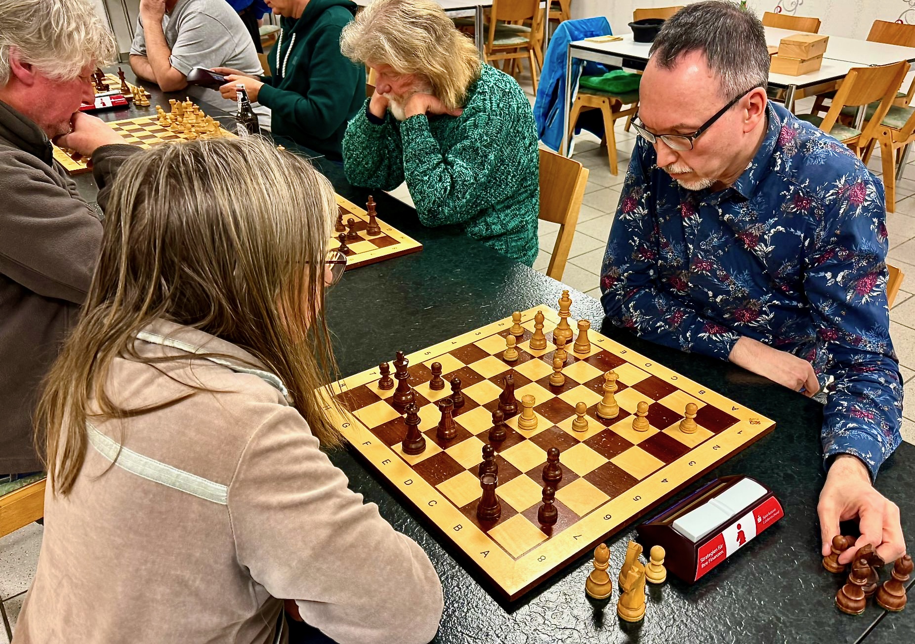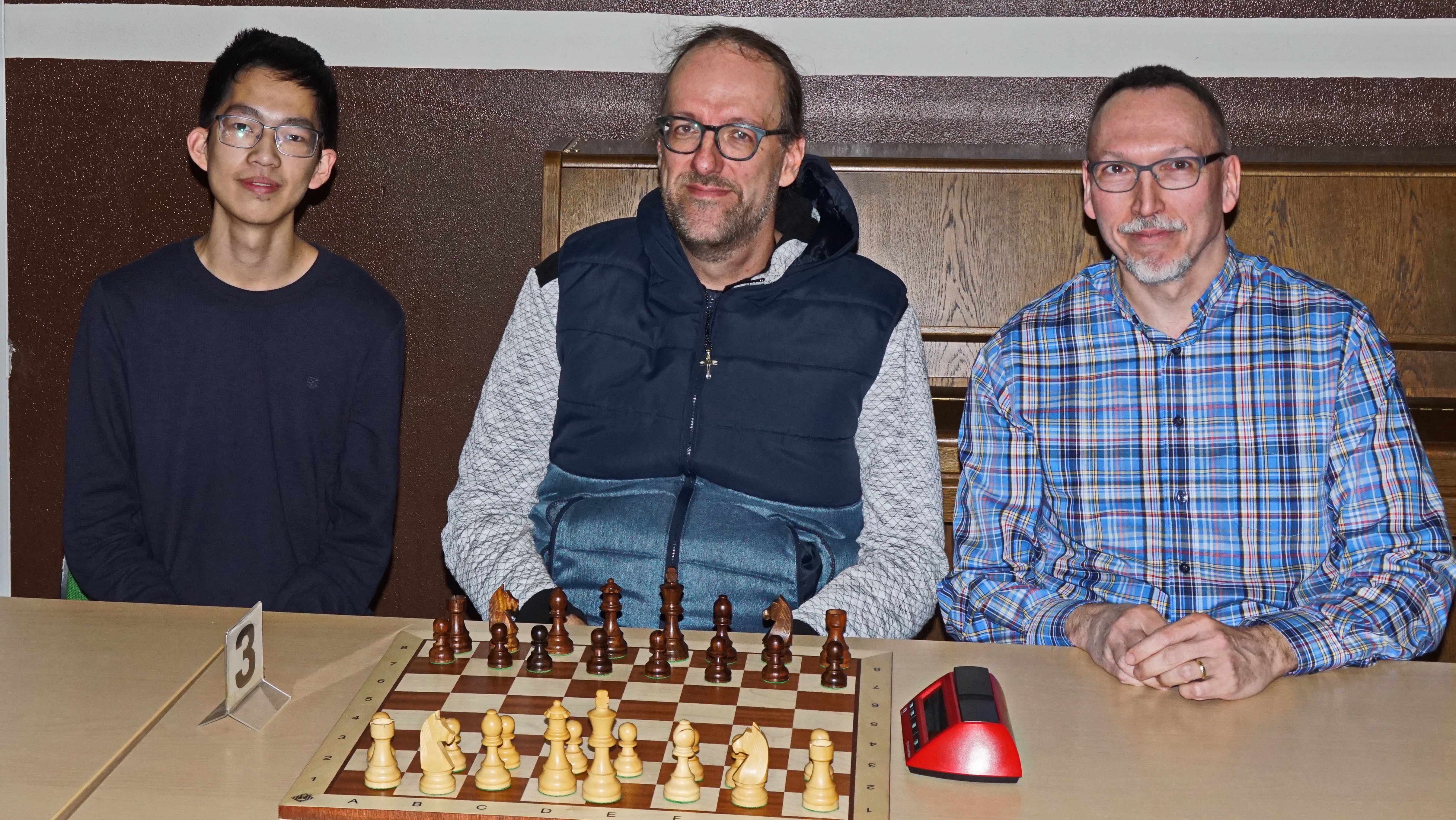 Halver, 24. November 2025: Am Montag endete die Vorrunde der Offenen Stadt- und Gemeindemeisterschaft von Halver und Schalksmühle. Im letzten Nachholspiel setzte sich Daniel Babczyk gegen Jesus Cabello Gonzalez durch. Damit kam es zur kuriosen Situation, dass in der Gruppe B Peter Kernchen, Daniel Babczyk und Ralph Kämper allesamt mit 5,0 Punkten und 11,0 Sonneborn-Berger-Punkten auf Rang eins landeten. Da in der Gruppe A hinter Dirk Jansen Jeff Piria und Mohamed Suleiman ebenfalls gleichauf lagen, wurde die Endrunde kurzum erweitert auf sechs Spieler. Die ersten Drei jeder Gruppe zogen in die A-Endrunde ein und nicht nur die besten zwei Akteure pro Gruppe. Die B-Endrunde wird deshalb nun nurmehr mit vier Aktiven gespielt. Das Turnier wird deshalb erst am 8. Januar abgeschlossen. Da die Punkte aus der Vorrunde mitgenommen werden in die Endrunde, geht Dirk Jansen (2,0) als Führender in die A-Endrunde, gefolgt von Kernchen, Kämper und Babczyk (alle 1,0), Piria und Suleiman (beide 0,5). In der B-Endrunde starten Josef Horstmann und Nora Jansen mit einem Punkt, Jesus Cabello Gonzalez und Rüdiger Nieland ohne Punkt in die letzte Turnierphase. Die Endrunden beginnen am 4. Dezember mit folgenden Spielen: Suleiman – Babczyk; Kämper – Piria, D. Jansen – Kernchen; Nieland – N. Jansen und Horstmann – Cabello Gonzalez.