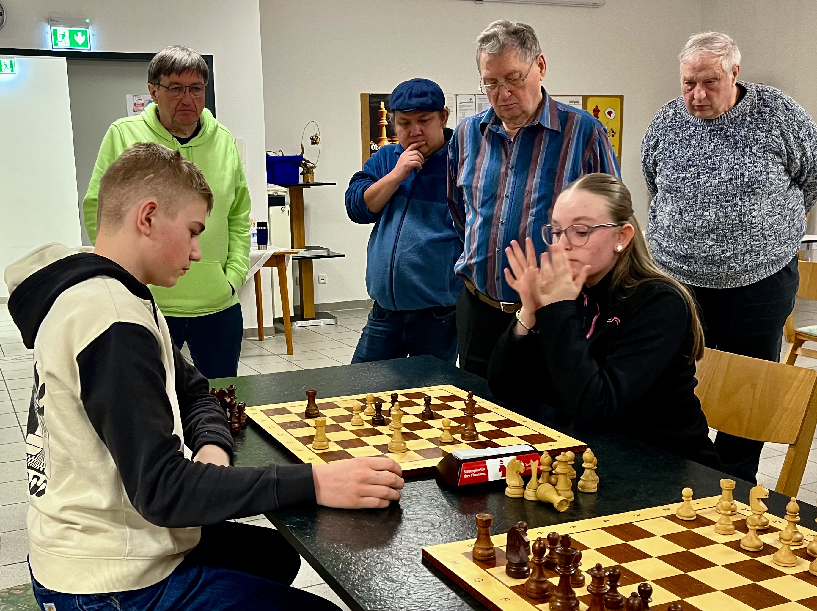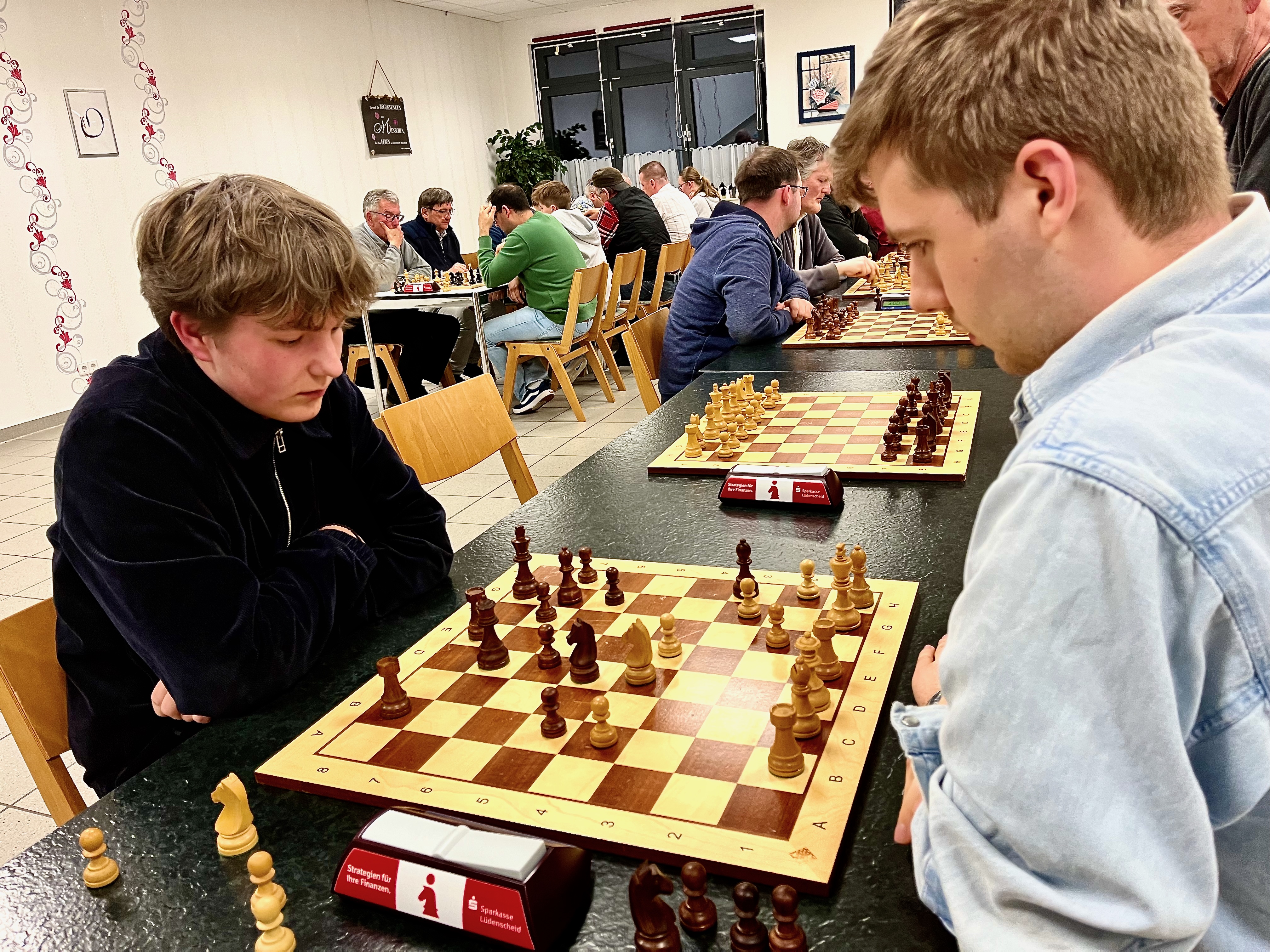 Max Lutze und Alex Browning haben sich am Schachbrett nicht nur einmal gegenüber gesessen. Am Samstag indes war es ein ganz besonderes Duell: In der 2. Bundesliga trafen in Erkenschwick im Spitzenspiel die Gastgeber vom SV Erkenschwick und die SG Porz aufeinander. Lutze spielt seit Sommer 2024 für Erkenschwick, Browning seit Sommer 2024 für den Verein aus Köln. Ausgerechnet zum direkten Duell stellten beide Vereine ihre jungen Halveraner als Ersatzspieler am 8. Brett auf. Lutze hatte gegen Browning, der Lutze beim MSHS auch trainiert hat, die weißen Steine. Es wurde eine spannende Partie, in der Browning nach Bauerngewinnen Vorteil zu haben schien, doch am Ende mündete die Partie nach 49 Zügen in ein Remis. Auch der Mannschaftskampf endete mit einem 4:4-Unentschieden. So ist nun Remagen alleiniger Spitzenreiter der 2. Bundesliga, dahinter aber folgen mit einem Punkt Rückstand Erkenschwick und Porz: Das Titelrennen in der 2. Bundesliga bleibt sowohl für Max Lutze als auch für Alex Browning ein spannendes.
